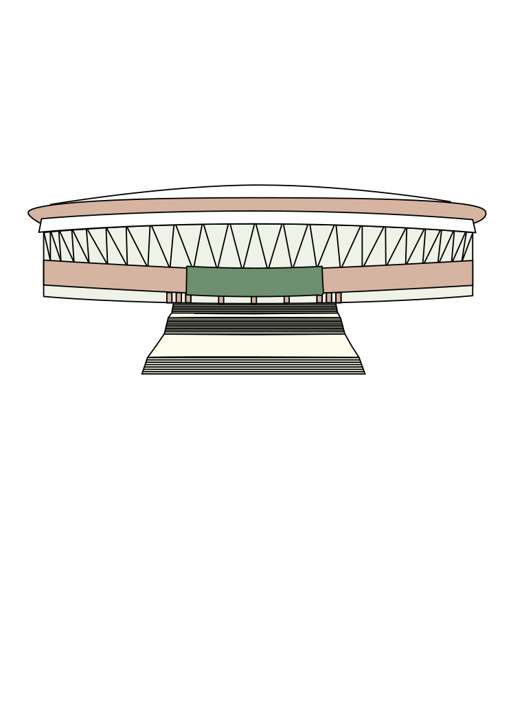 This features a large stadium with an open roof, likely designed for sports events or concerts. The stadium has multiple rows of seating, including the upper and lower sections, providing ample space for spectators to enjoy the event. The stadium's design is visually appealing, with its curved structure and unique shape that stands out against a white background. This image captures the essence of an impressive sports venue or entertainment center, ready to host various events and gatherings.
