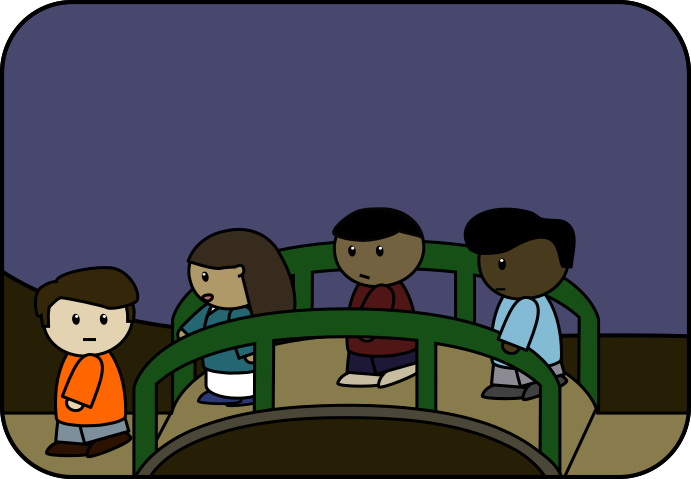 This features a group of four people sitting on a green bridge. They appear to be looking down, possibly scared or concerned about something below them. Each person is seated on one of the four benches that are placed along the length of the bridge. The scene gives off an eerie vibe as if they are observing something unsettling beneath their feet.