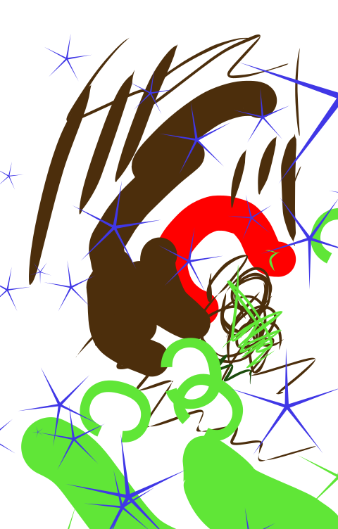 This is a colorful and abstract artwork featuring various shapes, including a large red C shape in the middle. There are also green colored letters on the bottom of the image, adding to its vibrant appearance. The overall composition of the piece appears to be a mix of different colors and patterns, creating an intriguing visual experience for viewers.