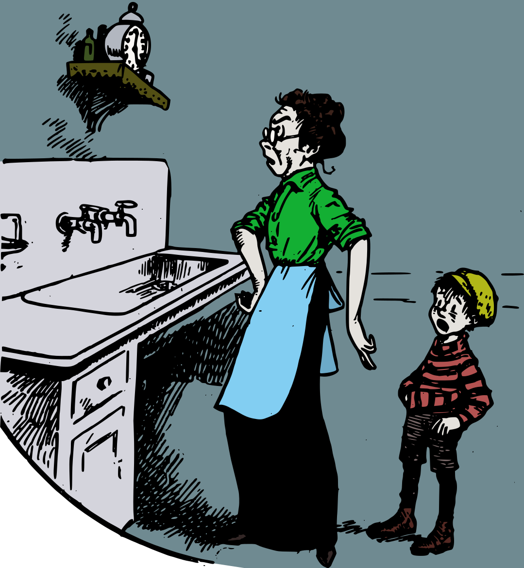 This features a woman and a young boy standing in a kitchen. The woman is wearing an apron, and the boy appears to be looking at her with curiosity or concern. They are both positioned near a sink, which is located on the left side of the room. A clock can also be seen hanging above the sink, adding to the cozy atmosphere of the kitchen scene.