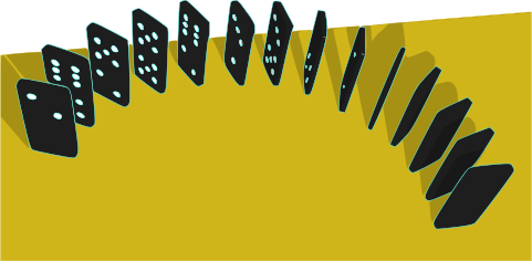 This features a unique perspective of a row of dominos standing on end. There are twelve dominos in total, arranged in a circular formation with each one slightly overlapping the next. The dominos vary in height and position, creating an interesting visual effect. This arrangement is reminiscent of a sunset or a rainbow, giving it a creative and artistic appearance.