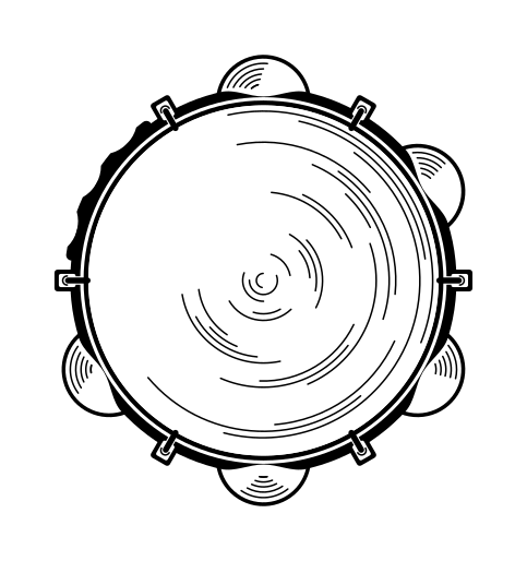 This features a round, black and white drawing of an instrument. It is described as a pandeiro, which is a musical instrument with a circular wooden body and five half circles on the edge. These half circles are likely used for striking the instrument's surface to produce different sounds. The drawing has a black outline surrounding the main image, giving it a clear and defined appearance.
