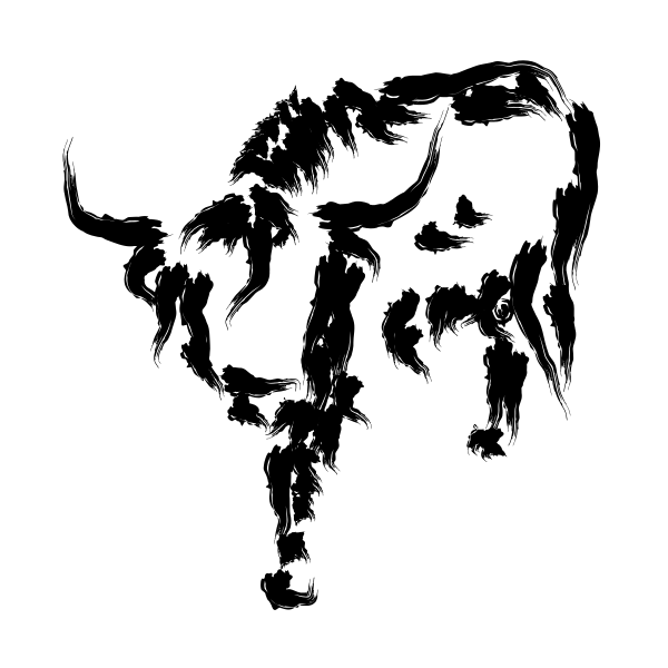 This is a black and white drawing of a bull, with its horns curled back. The bull's body is depicted in the foreground, while its head is shown in the background. The drawing captures the essence of the animal, showcasing its strength and power. The lines used to create this image are bold and distinct, giving it a striking appearance. Overall, the artwork effectively conveys the bull's presence and character through its simple yet powerful representation.