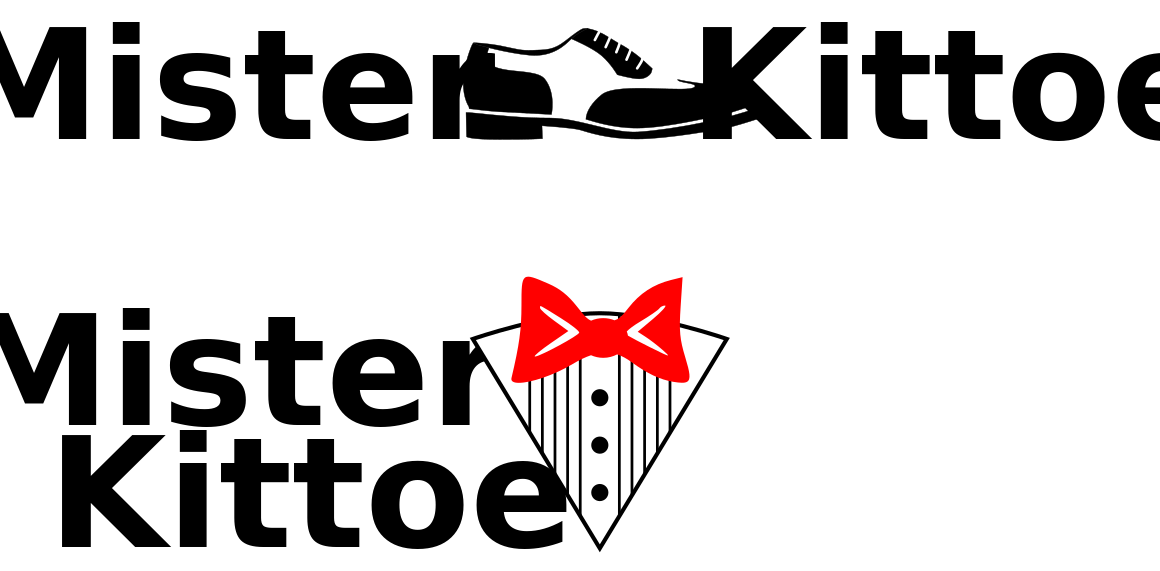 This features a black and white background with two different fashion logos. One logo is for Mr. Kitty, which has a bow tie design on it. The other logo is for Master Kitty, which also includes a bow tie as part of its design. These logos are placed side by side, creating an interesting visual effect.