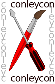 This features a logo for ConleyCon, which is an event that celebrates open art and software/hardware. The logo consists of two crossed paintbrushes and screwdrivers, symbolizing the creative process and the blending of technology with artistic expression. The design is simple yet effective in conveying the message behind ConleyCon.