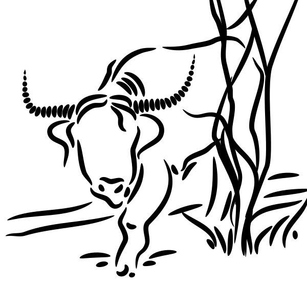 This features a bull with horns standing in front of a tree. The bull is positioned towards the left side of the scene, and its horns are clearly visible. The tree can be seen on the right side of the image, providing a natural backdrop for the bull. The overall atmosphere of the drawing suggests a sense of calmness as the animal stands in front of the tree.