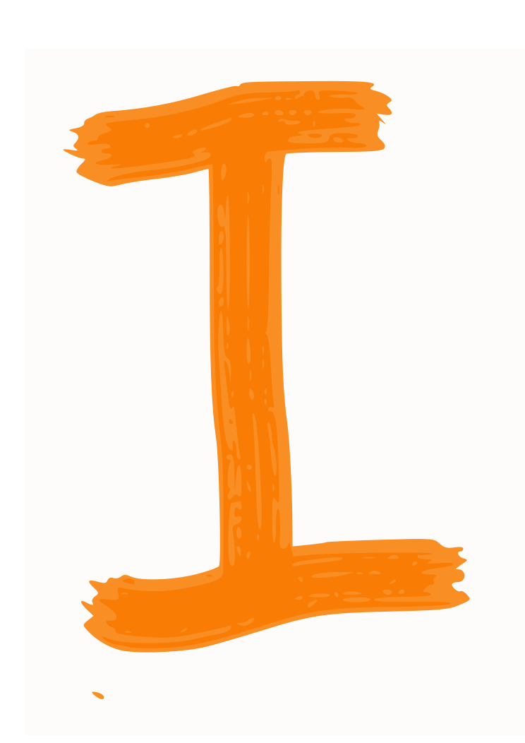 This features a large, handwritten letter I in orange. It is the only object in the scene and stands out against the white background. The letter appears to be drawn with a marker or other similar writing instrument, giving it a bold and distinctive appearance. The color of the letter is predominantly orange, making it easily noticeable and adding a touch of vibrancy to the image.