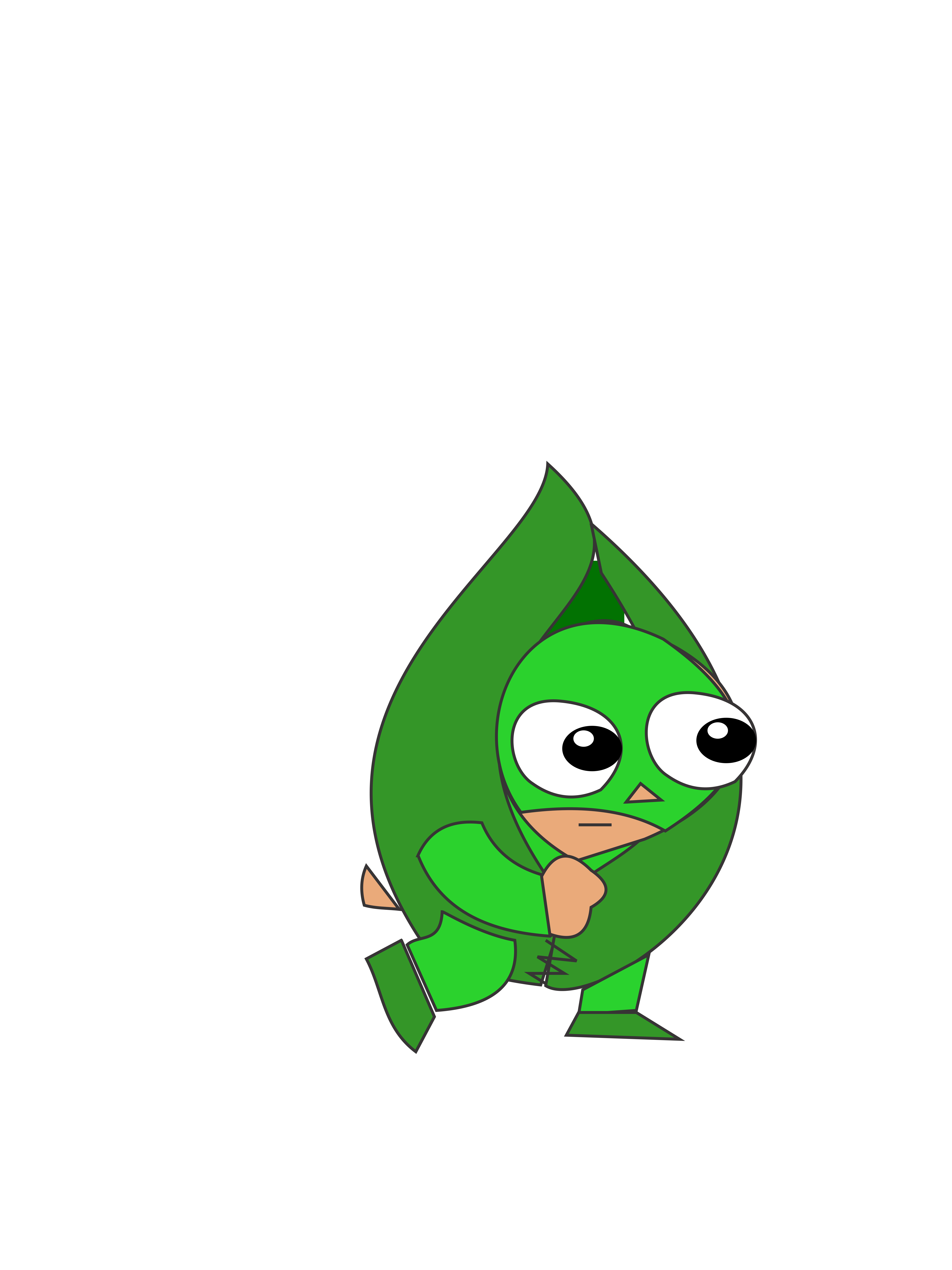 This features a cartoon character wearing a green outfit, possibly resembling a leaf or a costume. This character is standing in the center of the scene and appears to be looking at something off-camera. The character's facial expression suggests that it might be curious or intrigued by its surroundings. The overall atmosphere of the image seems playful, with the cartoon character being the main focus.