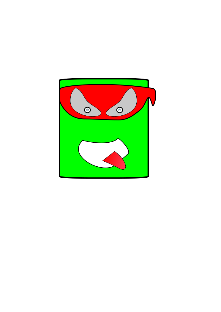 This features a cartoon-like character with a green face and red eyes, resembling the popular animated character "Teenage Mutant Ninja Turtles" (TMNT). This character is depicted as a can of soda or beverage, possibly a canman ninja. The can has an angry expression on its face, giving it a playful and fun appearance. The image is in color, with the green and red colors being particularly noticeable.