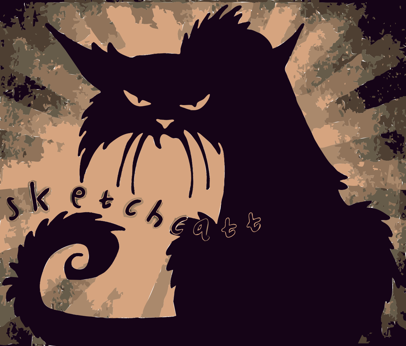 This features a black cat with an angry expression, standing in front of a brown background. It has a curled tail and appears to be the main focus of the scene. Above the cat's head, there is a text that reads "Sketchcats." This adds context to the image, suggesting it might be related to a sketch or drawing of a cat. The overall composition creates an interesting visual effect with the contrasting colors and the presence of the text.
