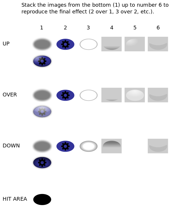 Tags: stack the images from the bottom up to number 6 to reproduce the final effect., kit button