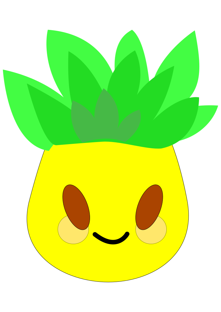 This features a colorful cartoon pineapple with a smiling face. It is brightly colored, predominantly yellow and green, giving it an appealing appearance. The pineapple's face has two eyes, one on the left side and another on the right side, as well as a mouth that appears to be smiling. This cheerful character could be used in various contexts such as advertising or decoration, adding a touch of fun and vibrancy to any setting it is placed in.