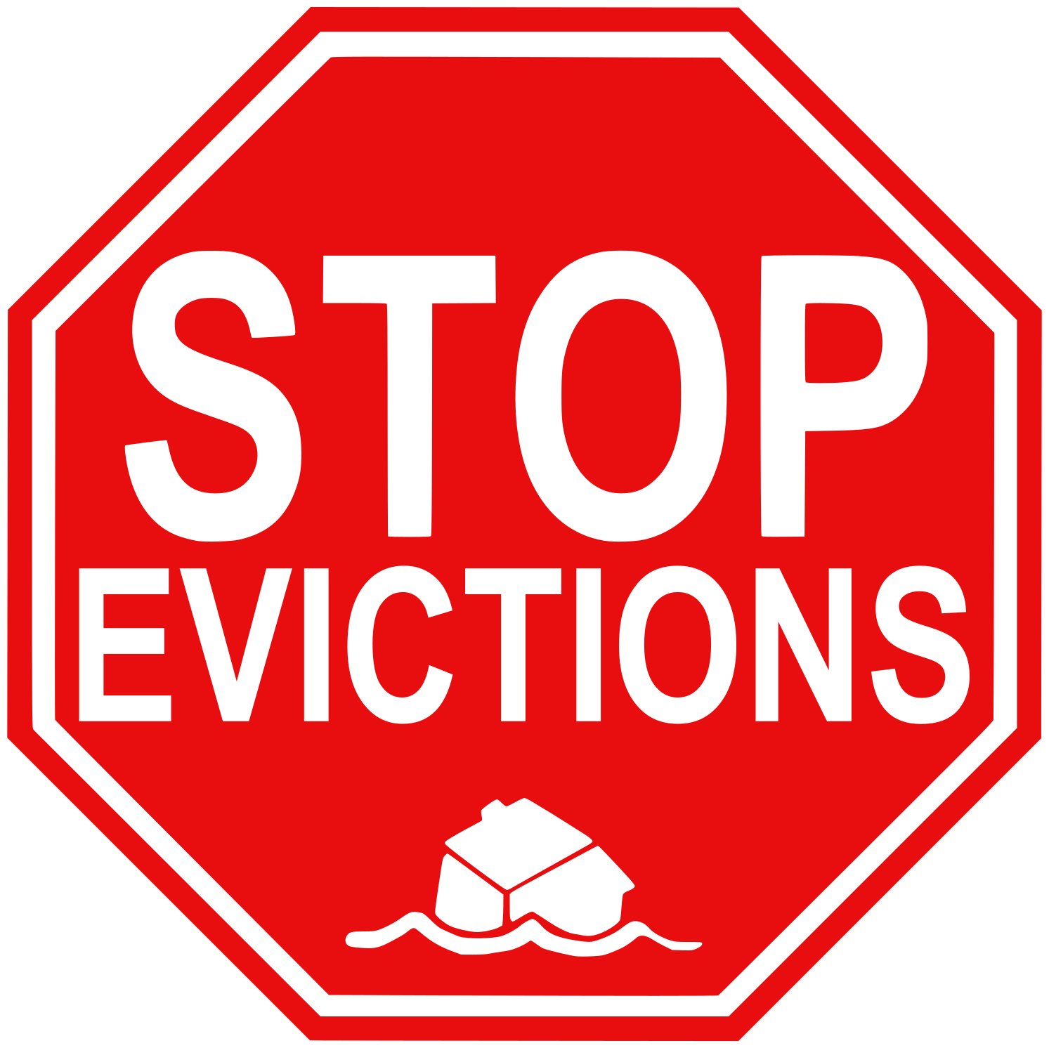 This features a red stop sign with white text that reads "STOP EVICTIONS." Below the text, there is an icon of a house. This sign serves as a visual representation to convey the message against evictions and encourages people to take action in stopping them. The bold red color and clear white lettering make it easy for viewers to read and understand the intended message.