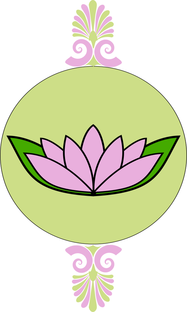 This features a round green frame with a pink lotus flower in the center. The lotus is surrounded by darker green outlines, giving it an elegant and sophisticated appearance. In addition to the main lotus, there are lavender flourishes surrounding the outer edge of the circle, adding a touch of color and visual interest to the overall design. This artwork creates a sense of harmony between nature's beauty and man-made elements, making it an appealing piece for those who appreciate both aspects.
