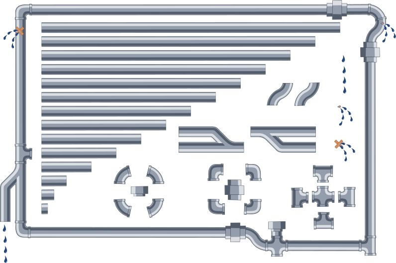 This features a white background with various pipes arranged in different shapes and sizes. There are at least 13 pipes visible, each varying in length and shape. Some of the pipes are positioned horizontally while others are placed vertically or diagonally. This arrangement creates an interesting visual effect that resembles a computer circuit board or a game controller. The pipes are spread out across the entire image, with some located towards the top left corner, while others can be found in the middle and bottom right sections of the background.
