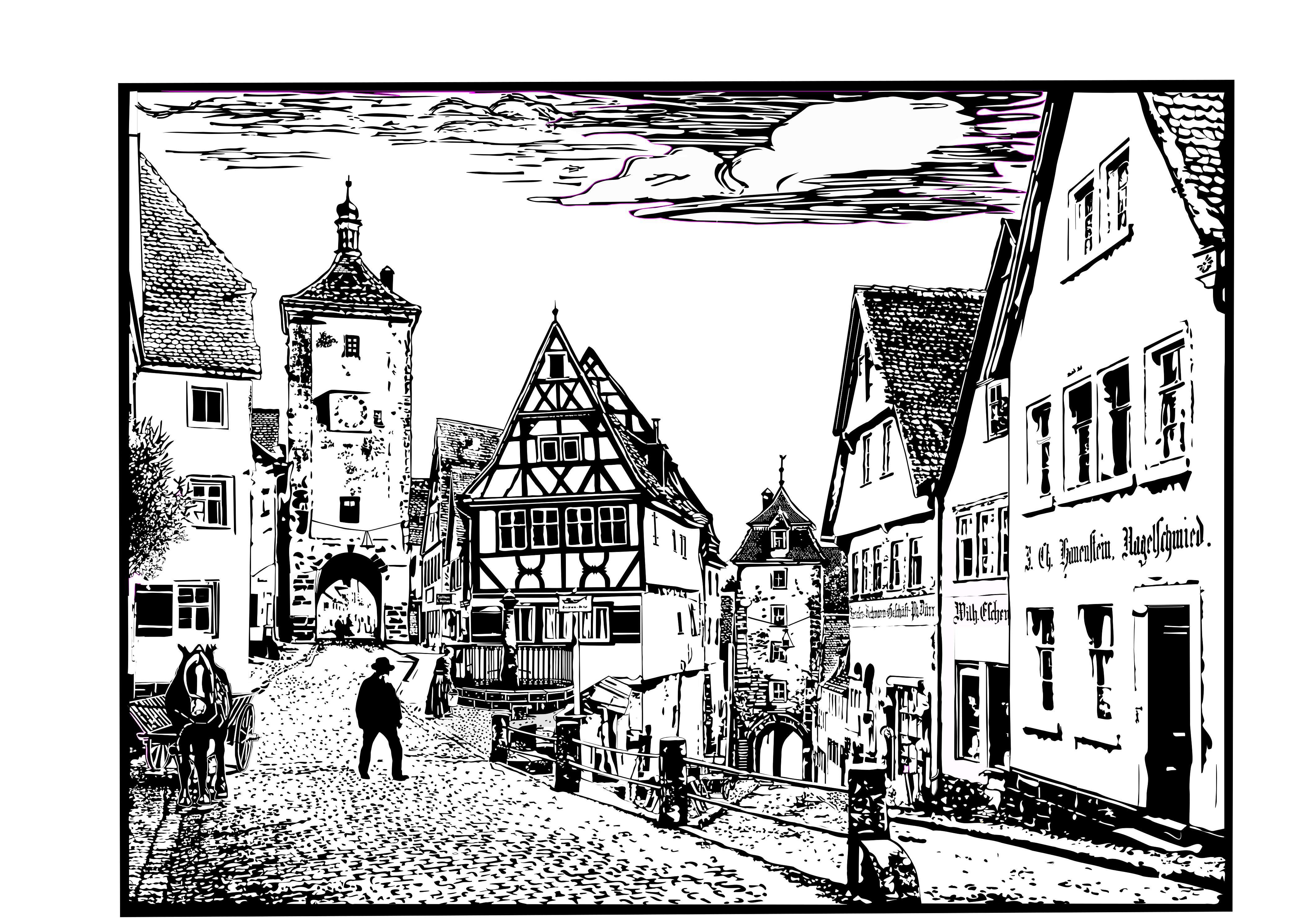 This is a black and white drawing of an old town with cobblestone streets. There are several houses in the scene, some of which have steeples on top. A person can be seen walking down the middle of the street, possibly exploring or enjoying the quaint atmosphere. In addition to the person, there is a horse and carriage visible near the left side of the image, adding to the historical charm of the town. The overall scene captures the essence of an old European village with its charming architecture and picturesque surroundings.
