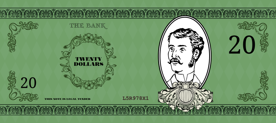 This features a twenty dollar bill from the United States of America. It is an old-fashioned banknote with a portrait of a man on it, and the words "The Bank of the United States" written at the top. The man's facial hair appears to be quite prominent, giving him a distinctive look. The banknote has a green background, which adds to its vintage appearance.