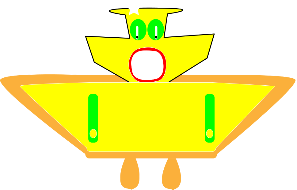 This features a yellow robot with green eyes and arms, standing on top of an orange outline. It appears to be screaming or making a funny face as it is the main focus of the picture. The robot's design gives it a playful and whimsical appearance, likely intended for entertainment purposes.