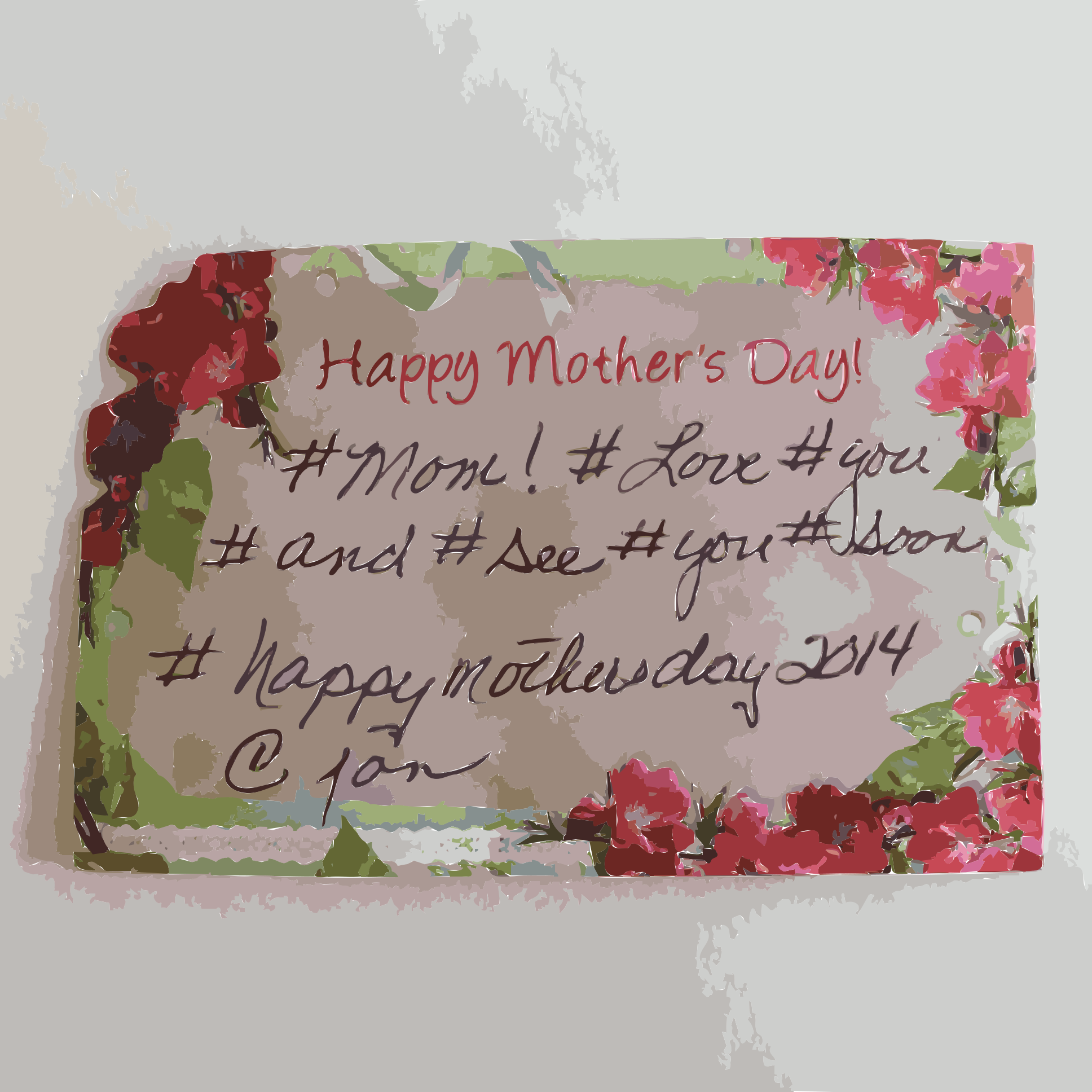 This features a card with a message written on it, wishing someone a Happy Mother's Day. The card is decorated with red flowers and has the words "Happy Mother's Day" written at the top of the card. Below this, there are various hashtags written out, including #mom, #love, #see, #you, #and, #see, #you, #see, #you, #see, and #you. The card is addressed to someone named "Mom" and appears to be a heartfelt message for the special occasion.
