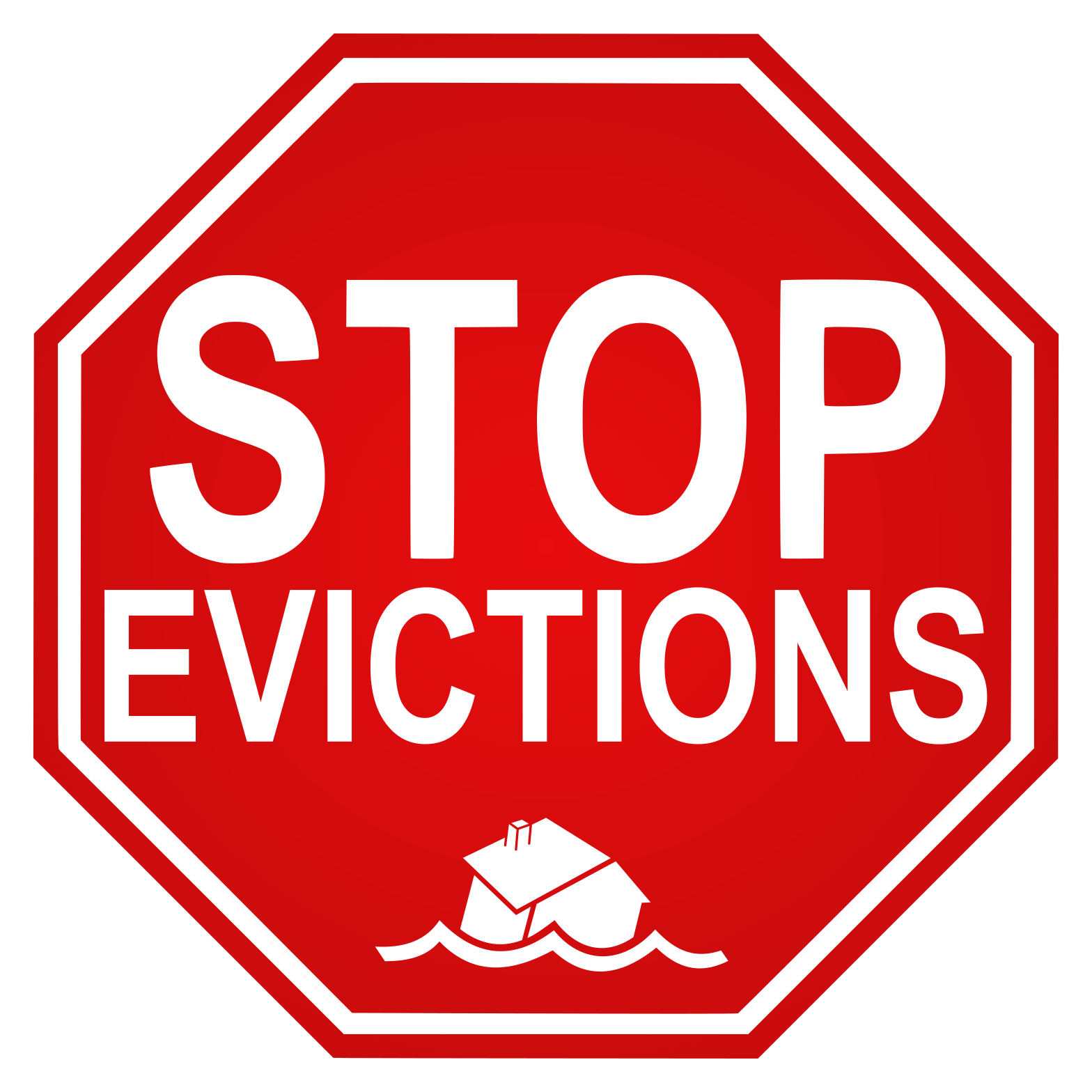 This features a red stop sign with white letters that reads "Stop Evictions." This sign is likely meant to convey a message against eviction, possibly advocating for tenant rights or housing justice. The bold red color of the sign and its prominent placement on a white background make it easily noticeable and attention-grabbing. The use of such a recognizable symbol as a stop sign adds an element of urgency to the message being conveyed by the sign, encouraging people to take action against evictions or support those who are facing them.