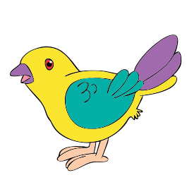 This features a colorful cartoon bird with an open beak, standing on one leg. It has a yellow body and a blue tail, making it visually striking. The bird appears to be in the middle of a pose or action, possibly singing or communicating with others. Its vibrant colors and unique design make it an interesting and eye-catching image.