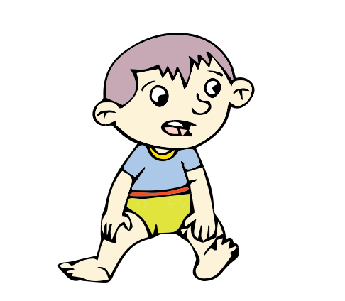 This features a cartoon drawing of a young child, possibly a toddler or a baby. The child is sitting down and wearing a blue t-shirt with yellow shorts. The child appears to be making a funny face as they sit in the picture. The overall scene has a playful and lighthearted atmosphere, likely meant for entertainment purposes.