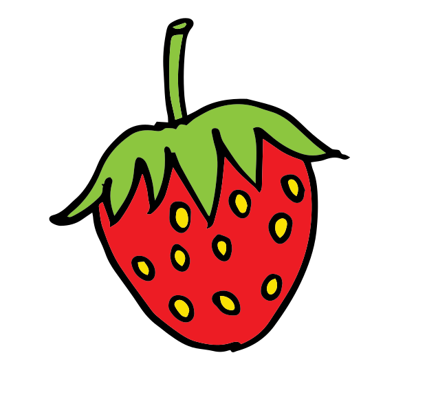 This features a large, red strawberry with yellow spots. It is depicted in a cartoon-like style and has a black outline around it. The strawberry appears to be the main focus of the image, taking up most of the frame.