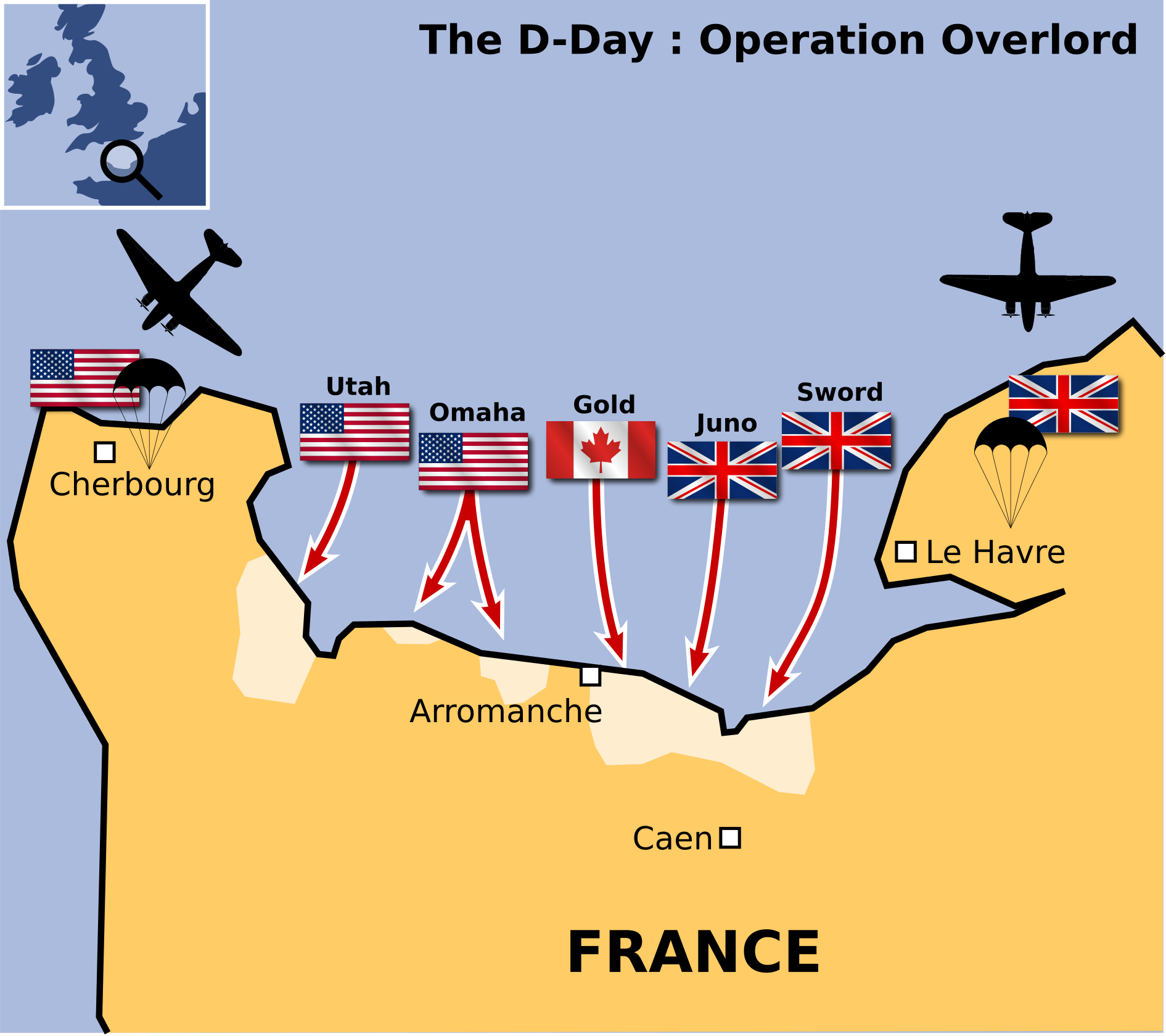 This is a map of Europe, specifically focusing on the D-Day operation. It shows various countries and their flags, including France, Germany, Canada, and the United States. There are also several airplanes scattered across the map, indicating the involvement of different nations in this historical event. The map is divided into sections, with each section representing a specific country or region. The flags are placed on top of these sections to indicate their participation in the D-Day operation. Additionally, there are arrows pointing towards certain locations, possibly indicating key points of interest or strategic locations during the invasion. Overall, this map provides an overview of the involvement and contributions of various countries in Operation Overlord.