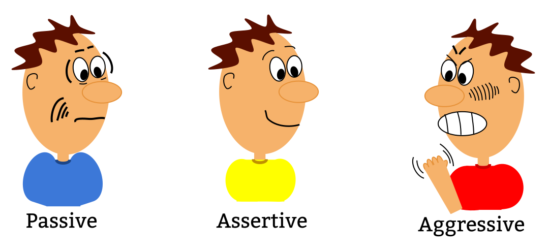 This displays three cartoon characters representing different behavior types: Passive, Aggressive and Assertive. Each character is depicted with a distinct facial expression to convey their respective traits. The first character on the left represents Passive behavior, which involves not standing up for oneself or allowing others to walk all over them. This character appears sad and submissive. The second character in the middle represents Aggressive behavior, where individuals bully people into doing what they want or force their opinions upon others. This character is shown with a frowning expression and an angry demeanor. Finally, the third character on the right represents Assertive behavior, which involves stating one's needs and wants in a non-emotional manner. The assertive character appears confident and composed, displaying no signs of sadness or aggression. This image effectively illustrates the differences between these three types of behavior through its cartoon characters.
