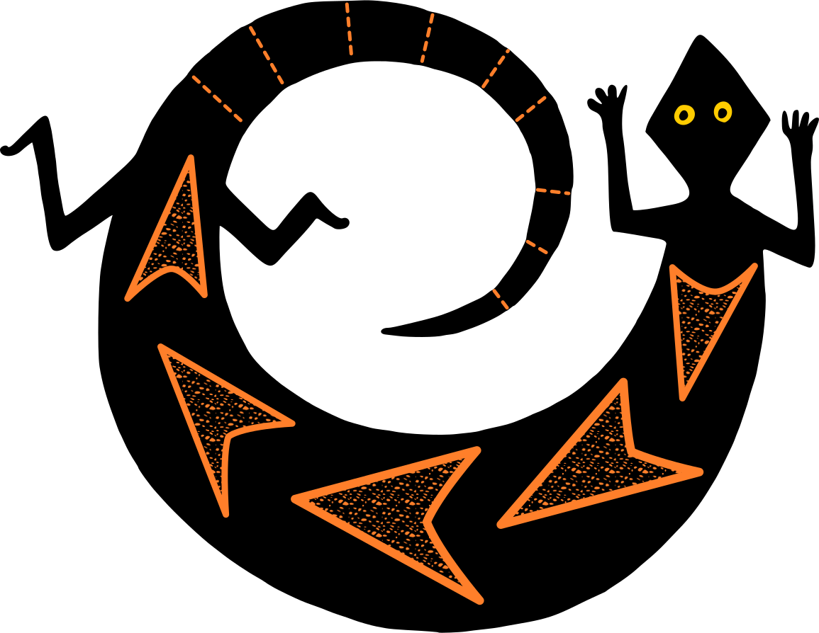 This features a black and orange lizard with long curved tail, standing on top of an orange circle. It has legs and arms, giving it a more human-like appearance. There are several orange arrows scattered across the lizard's body, adding to its unique and scary appearance. The lizard seems to be looking upwards, possibly at something that caught its attention or is causing it to react in some way. Overall, this image presents an intriguing and somewhat intimidating creature with a striking design.