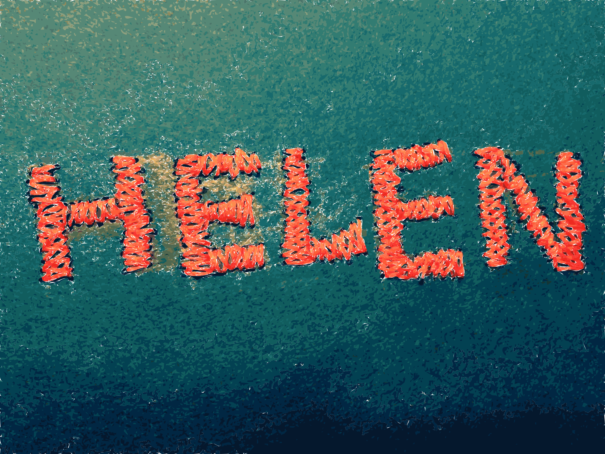 This features a large, colorful sign that reads "Helen" in orange letters. The word is made up of several smaller words arranged in a visually appealing manner. The sign appears to be stitched onto the cloth, giving it a unique and artistic appearance. This creative display could be used for various purposes such as advertising or decoration, drawing attention to the name Helen with its vibrant colors and intricate design.