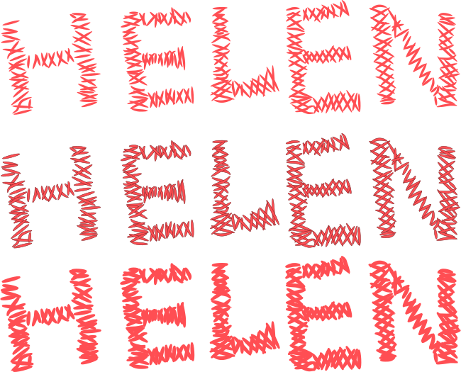 This features a red background with the word "Helen" written in large, bold letters. The letters are made up of many small, individual stitches that create an interesting texture and visual effect. The stitches vary in size and position, giving the impression of a hand-stitched or embroidered appearance. This unique presentation of the word "Helen" adds a creative touch to the overall design.