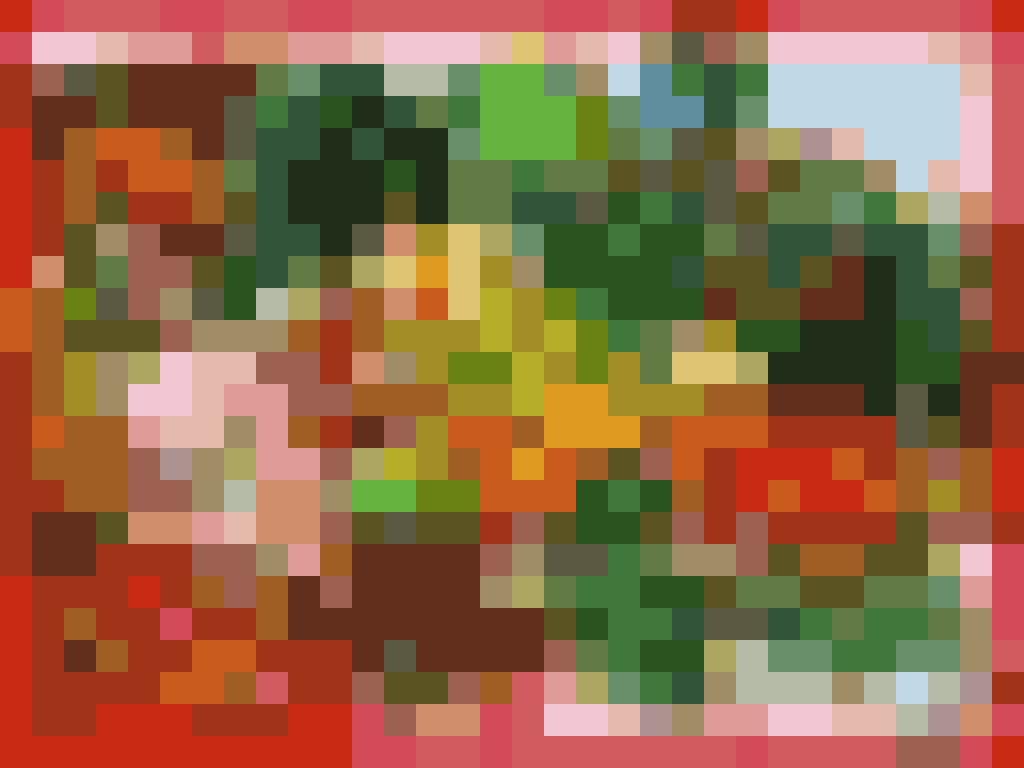 This is a colorful, pixelated picture of a garden scene. In the center of the picture, there are two people standing next to each other, surrounded by various plants and flowers. There are several trees in the background, adding to the lush greenery of the scene. Additionally, there are multiple birds scattered throughout the image, some flying near the top left corner while others are perched on branches or hovering above the ground. The overall atmosphere is vibrant and full of life, with a mix of natural elements that create an engaging visual experience.