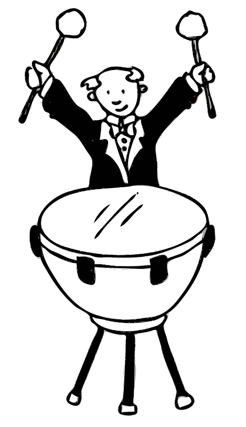 This features a cartoon drawing of a man holding two drumsticks, standing next to an oversized drum. He appears to be dressed in formal attire and is wearing a bow tie. The large drum takes up most of the scene, with its size dwarfing the man who stands beside it. This whimsical illustration captures the essence of a timpanist in action, showcasing their passion for music and dedication to their craft.