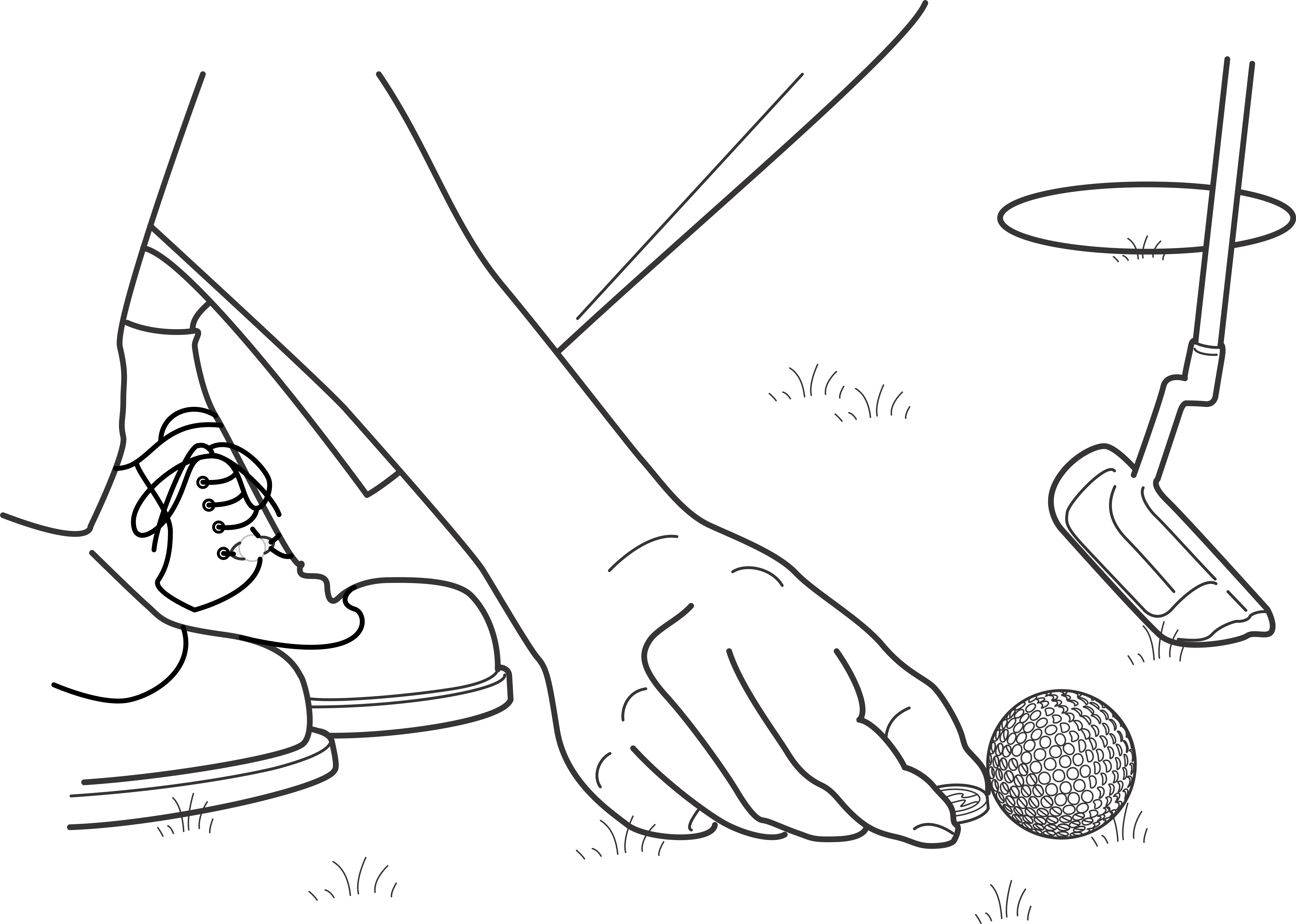 This depicts a person playing golf, with their hand holding the ball and the club in position. They are standing on a grassy field, which is typical for a golf course setting. The player's focus is on placing the golf ball on the ground, likely preparing to take a shot or continue their game. The scene captures the essence of the sport, with the golfer demonstrating skill and concentration as they navigate the course.