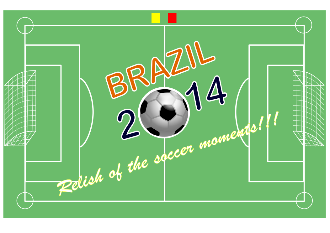This features a green soccer field with the words "Brazil 2014" written in the middle of it. A large soccer ball is also present, adding to the theme of the scene. The field appears to be a part of an advertisement or promotional material for the upcoming World Cup event in Brazil. The text on the image reads "relish of the soccer moments!!!" which suggests that this could be related to a sports-themed event, possibly celebrating the excitement and anticipation surrounding the 2014 FIFA World Cup.