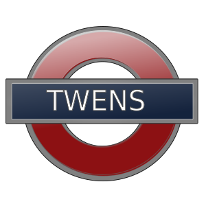 This features a red and black round sign with the word "TWENS" written on it. This sign is likely used to identify or indicate the location of a particular place, such as a train station or bus stop. The bold colors and clear text make it easy for people to read and recognize the sign from a distance.