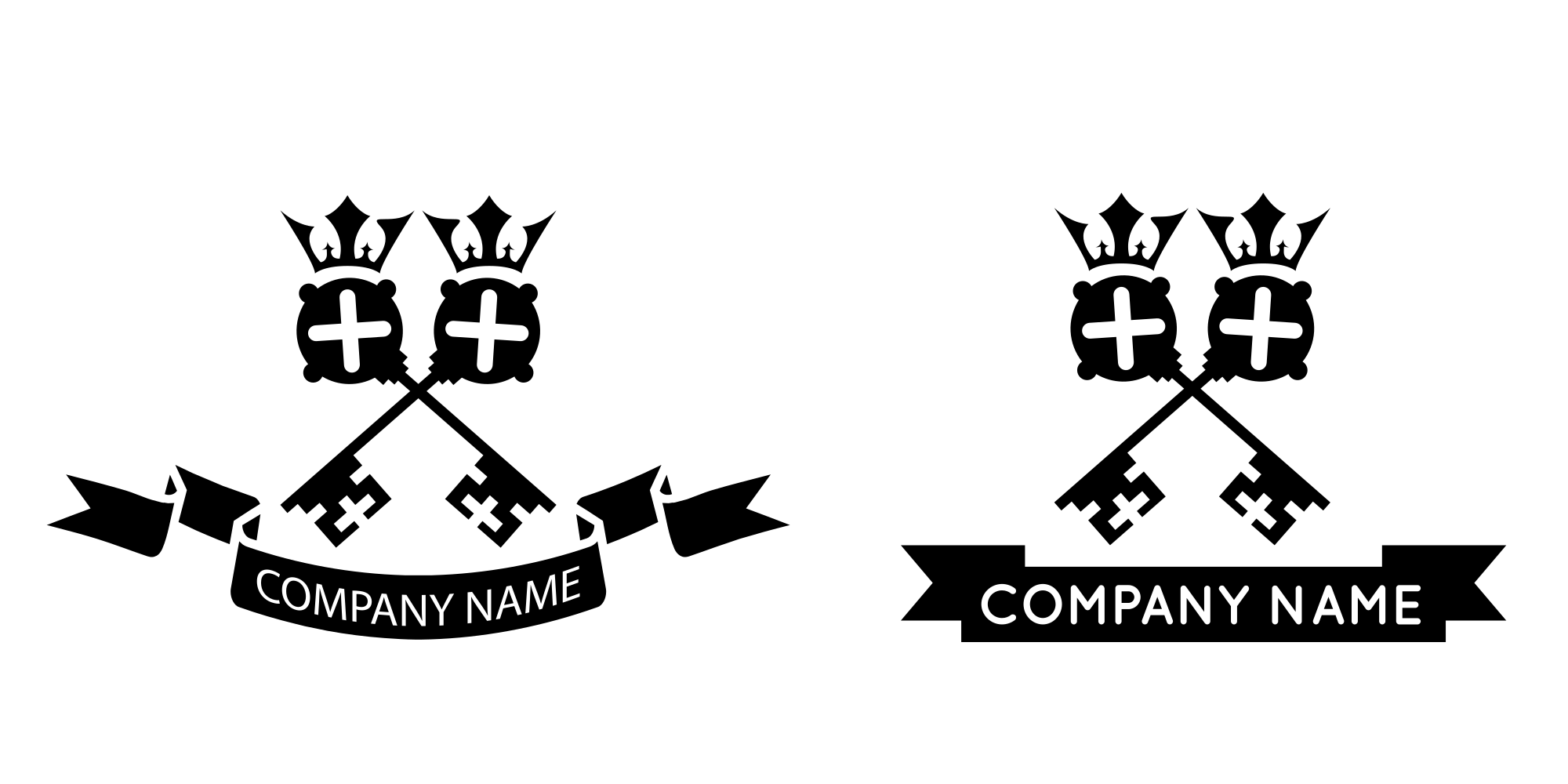 This features two different kinds of key logos, each with a unique design. One logo is a shield-like emblem with a crown on top and the words "Company Name" written below it. This logo appears to be more formal in nature, possibly representing a corporate or business entity. The other logo is a cross with two swords underneath it, accompanied by the words "Company Name." This design seems to convey a sense of strength and protection, which might be associated with a security company or organization. The two logos are placed side by side on a white background, making them stand out clearly against the plain backdrop.