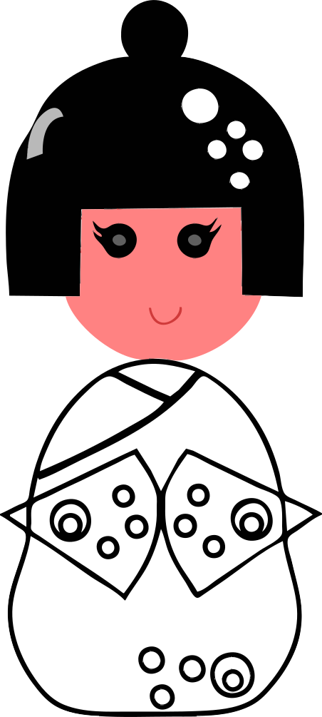 This features a black and white drawing of an Asian woman, possibly a geisha or a similar character. She is wearing a kimono, which is a traditional Japanese garment. The woman's face has a smiling expression, adding to the overall cheerful atmosphere of the drawing. The artwork showcases her attire and captures her unique features, making it an interesting piece of visual content.