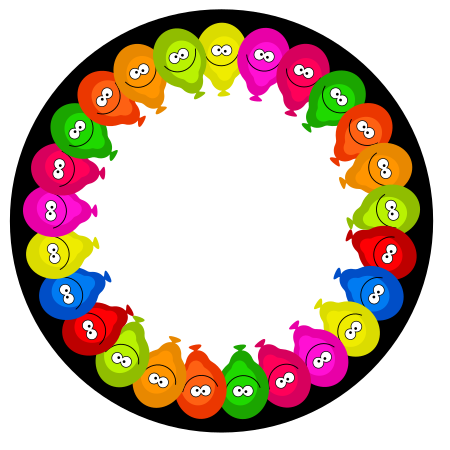 This features a large circle with a group of colorful, round characters arranged around it. These characters are made up of various shapes and sizes, including some that resemble bananas or other fruits. They all have smiling faces, giving the impression of a cheerful and friendly atmosphere. The circle is divided into sections, each containing one of these delightful characters. The arrangement creates an interesting visual effect, as if the characters are interacting with each other in a playful manner. This unique composition makes for an engaging and captivating image that can be appreciated by people of all ages.