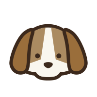 This features a brown and white dog with two light brown patches on its face. It has large, round eyes that are black in color. The dog's ears are brown and located on the sides of its head. This cartoon puppy appears to be smiling or showing off its teeth, giving it a friendly and playful appearance.