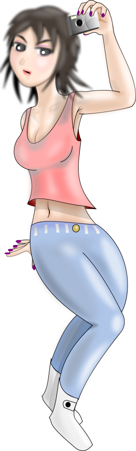 This features a cartoon drawing of a woman wearing tight jeans and a pink top. She is holding up her cell phone, taking a picture or recording a video. The woman has a distinctive look on her face as she captures the moment. In addition to her outfit, she also has a pair of white shoes visible in the image.