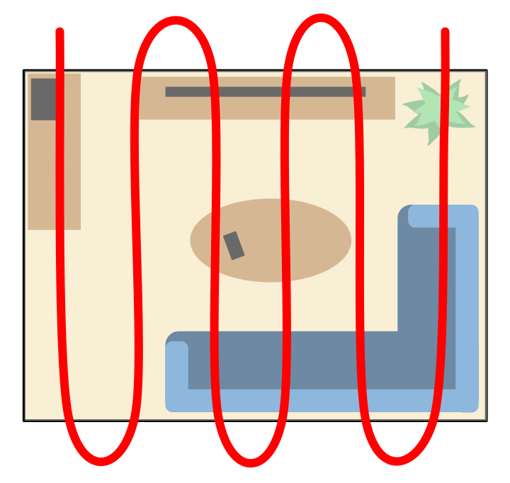 This features a room with various pieces of furniture, including a couch and a chair. There is also a dining table in the scene. A potted plant can be seen placed near the top right corner of the room. Additionally, there are two bowls located on the floor, one closer to the center of the room and another towards the left side. The overall setting appears to be a cozy living space with a touch of greenery from the plant.