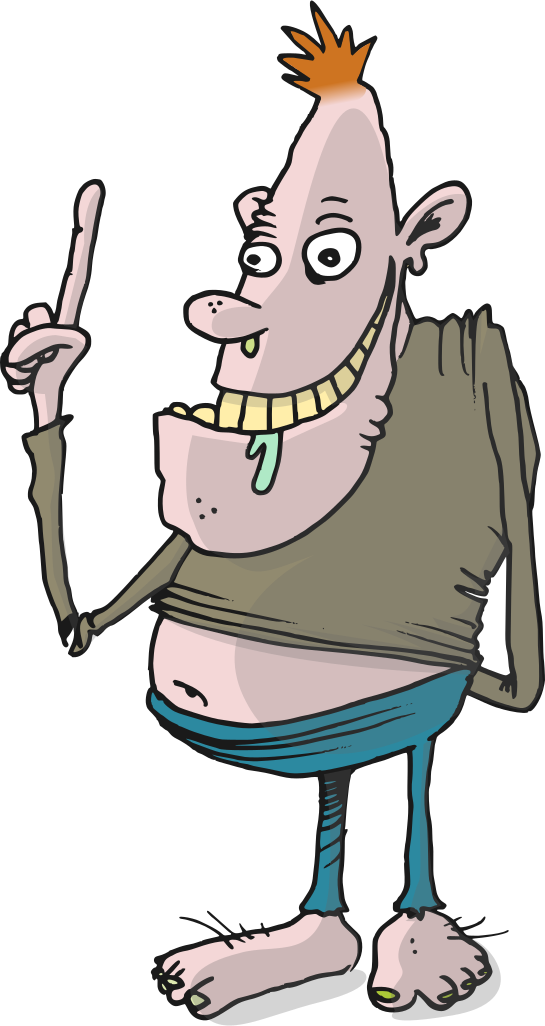 This features a cartoon character with an exaggerated belly, wearing a brown shirt and pointing at something. This character has a distinctive appearance, as it is drawn in a comical manner, giving the impression of being very fat. The character's facial expression appears to be somewhat angry or displeased, adding to its humorous nature. The cartoon figure seems to be standing on one foot, further emphasizing its unique and amusing design.