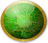 This features a green circuit board in the shape of a circle. The border around the outside of the circle is gold, giving it an appealing and professional appearance. Inside the green circle, there are various lines and shapes that create a complex pattern, resembling a computer circuit or a network diagram. This unique design makes for an interesting and visually engaging piece of artwork or decoration.
