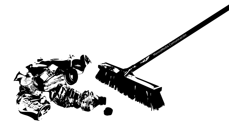 This features a black and white photo of a broom, which is being used to sweep up trash. The broom has a long handle that extends from the top left corner of the frame all the way down to the bottom right corner. There are several balls scattered around the scene, with some near the center of the image and others closer to the edges. Additionally, there is a motorcycle in the background on the left side of the photo, adding an interesting element to the composition.