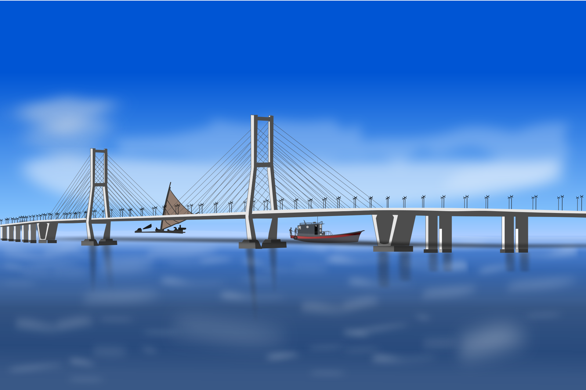 This features a large bridge that spans across the water, connecting two different areas. This impressive structure is known as the Bridge Suramadu and is located in Indonesia. In addition to the bridge, there are several boats visible on the water below it, including one boat near the left side of the bridge and another closer to the right side. The scene also includes a person standing near the middle of the image, possibly enjoying the view or attending to their boat. Overall, this illustration captures the beauty and functionality of the Suramadu Bridge in its natural surroundings.
