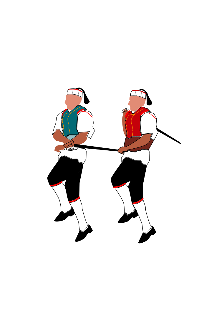 This features two men dressed in costumes, standing next to each other and holding swords. They appear to be performing a sword dance or participating in some kind of ceremony. Both men are wearing ties as part of their attire, adding an element of formality to the scene. Their synchronized movements suggest that they have practiced this performance together, likely as part of a larger group or event. The image captures the essence of tradition and cultural heritage through these two individuals' participation in the dance.