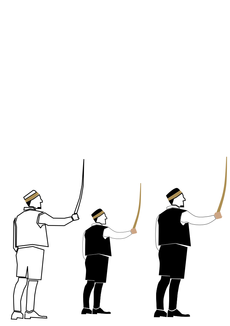 This depicts a group of men standing in formation, each holding a long sword. They are arranged in a way that resembles a military unit, with one man leading the others. This scene appears to be part of a traditional ceremony or performance, as they are all dressed similarly and appear to be participating in a coordinated event. The presence of multiple swords held by each individual suggests that this is an important aspect of their tradition or celebration. Overall, the image conveys a sense of unity and shared purpose among the group members.