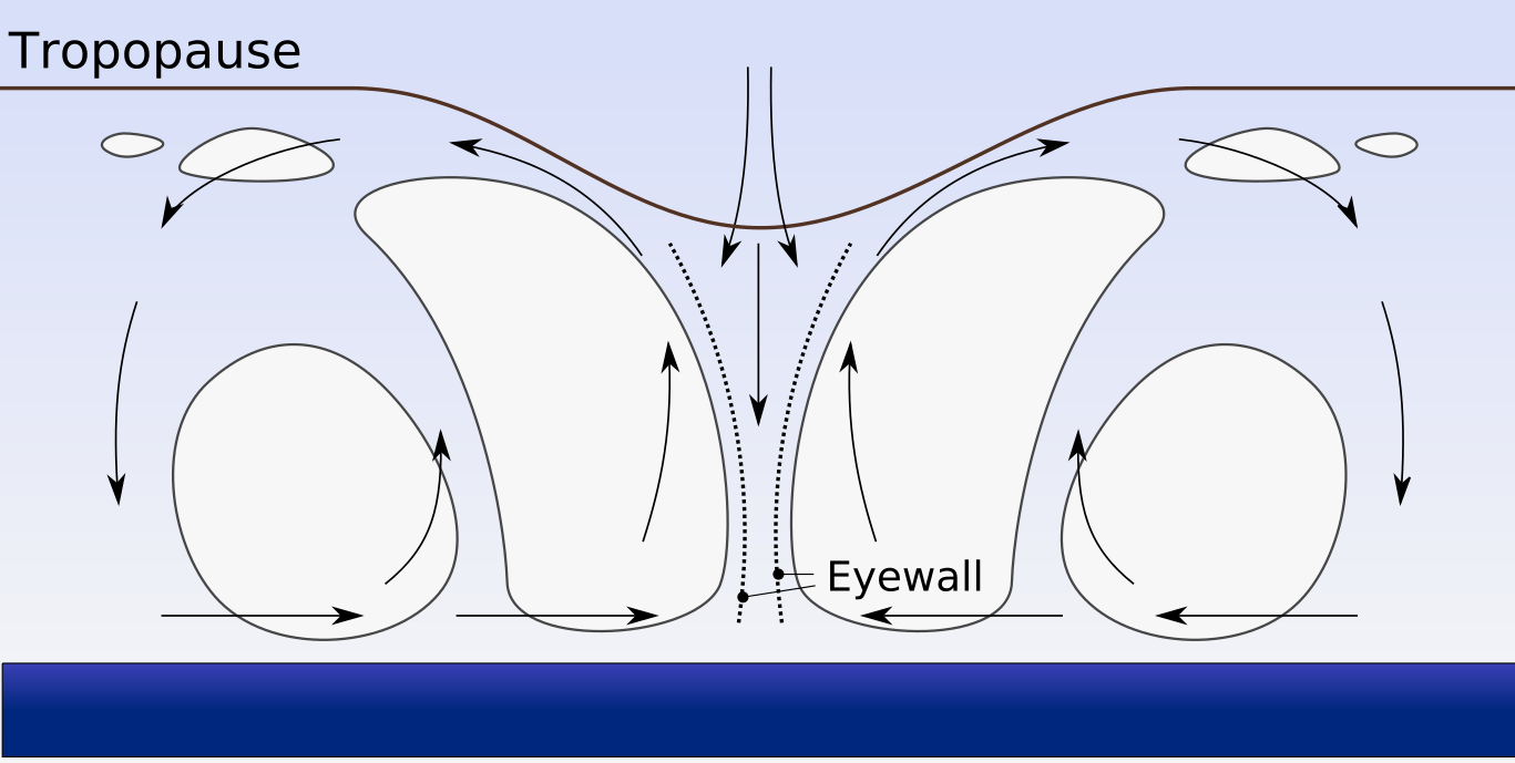 This depicts a diagram of the inside of an eye wall, with arrows pointing outward from the center. The eye wall is described as having a "tropopause" and "eyewall." The diagram also shows the direction of wind flow in relation to the eye wall. This illustration provides insight into the structure and dynamics of hurricanes, which are powerful storms that can cause significant damage when they make landfall.